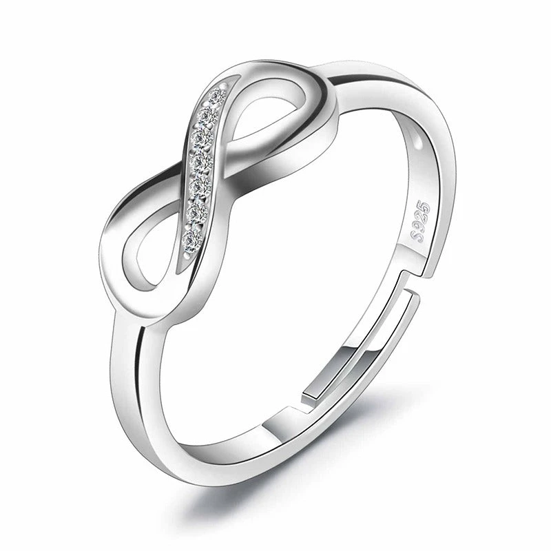 Surprenez votre moitié avec la bague Infinie ajustable, de qualité premium, en Argent Sterling 925 et dotée de cristaux blancs. Elle n’aura ainsi plus aucun doute sur votre amour et sera comblée toute l’année.